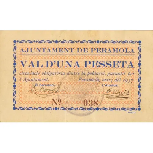 AJUNTAMENT DE PERAMOLA VAL D`UNA PESSETA circulació obligatòria dintre la població, garantit per l`Ajuntament Peramola, març del 1937. (Translation: City Council of Peramola Voucher of One Peseta mandatory circulation within the location, guaranteed by the City Council Peramola, March 1937.) |