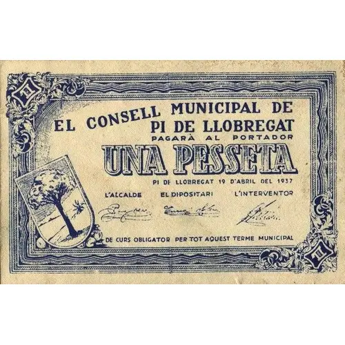 1 EL CONSELL MUNICIPAL DE PI DE LLOBREGAT PAGARÀ AL PORTADOR UNA PESSETA PI DE LLOBREGAT 19 D`ABRIL DEL 1937 DE CURS OBLIGATORI PER TOT AQUEST TERME MUNICIPAL (Translation: The Municipal Council of Pi de Llobregat Will pay the bearer One Peseta Pi de Llobregat, April 19, 1937 Of mandatory course for all this Municipal term) |