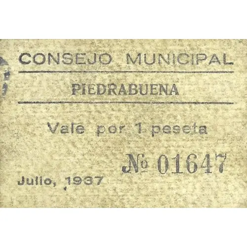 CONSEJO MUNICIPAL PIEDRABUENA Vale por 1 peseta Julio, 1937 (Translation: Municipal Council Piedrabuena Valid for 1 Peseta July, 1937) |