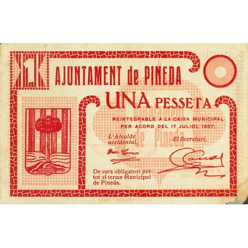 (Translation: City Council of Pineda 1 Peseta This banknote must be presented for reimbursement before January 1, 1938.)