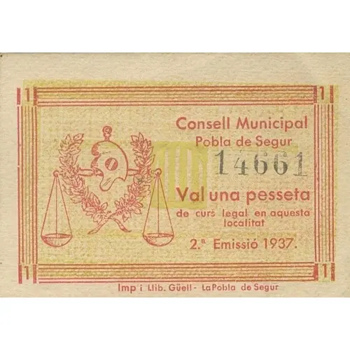 Consell Municipal Pobla de Segur Val una pesseta de curs legal en aquesta localitat 2.ª Emissió 1937. (Translation: Municipal Council Pobla de Segur Voucher One Peseta of legal course in this location 2nd Issue 1937) |