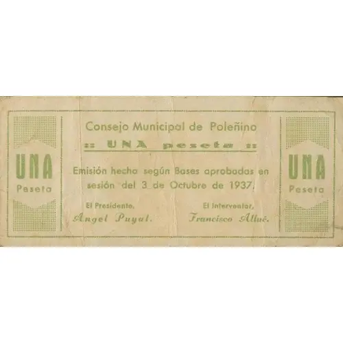 UNA Peseta Consejo Municipal de Poleñino UNA peseta Emisión hecha según Bases aprobadas en sesión del 3 de Octubre de 1937. (Translation: One Peseta Municipal Council of Poleñino One Peseta Issue made according to Bases approved in session of October 3, 1937.) |