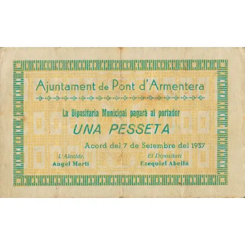 Ajuntament de Pont d`Armentera La Dipositaria Municipal pagarà al portador UNA PESSETA Acord del 7 de Setembre del 1937 (Translation: City Council of Pont d`Armentera The Municipal Depositary will pay the bearer One Peseta Agreement September 7, 1937) |