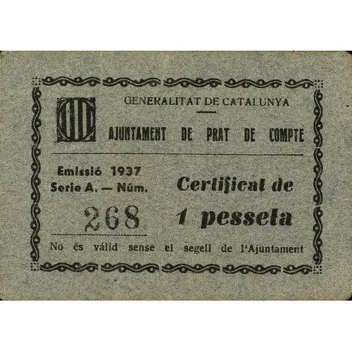 GENERALITAT DE CATALUNYA AJUNTAMENT DE PRAT DE COMPTE Emissió 1937 Certificat de 1 pesseta No és vàlid sense el segell de l`Ajuntament (Translation: Government of Catalonia City Council of Prat de Compte Issue 1937 1 Peseta certificate It is not valid without the stamp of the City Council) |