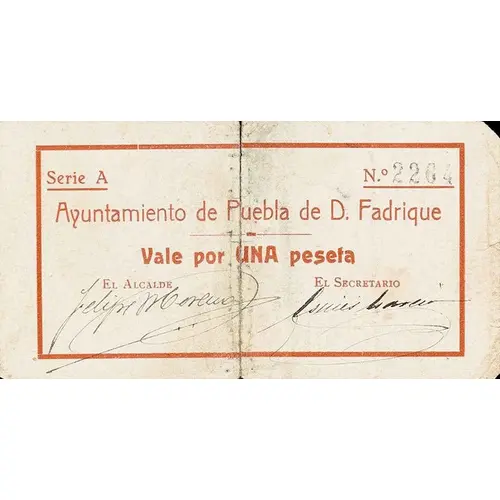 | Obverse lettering | Ayuntamiento de Puebla de D. Fadrique Vale por UNA peseta (Translation: City Council of Puebla de Don Fadrique Voucher for One Peseta) |