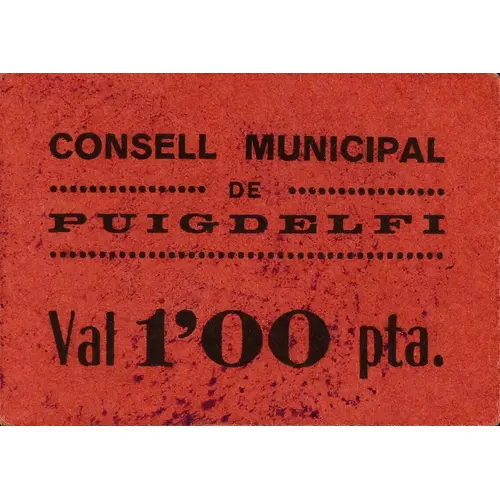 CONSELL MUNICIPAL DE PUIGDELFI Val 1`00 pta. (Translation: Municipal Council of Puigdelfí It`s worth 1.00 Peseta) |