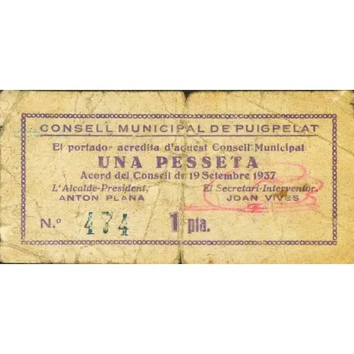 CONSELL MUNICIPAL DE PUIGPELAT El portador acredita d`aquest Consell Municipal UNA PESSETA Acord del Consell de 19 Setembre 1937 1 pta. (Translation: Municipal Council of Puigpelat The bearer credits this Municipal Council One Peseta Council agreement of September 19, 1937 1 Peseta) |