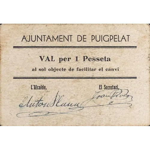 AJUNTAMENT DE PUIGPELAT Val per 1 Pesseta al sol objecte de facilitar el canvi (Translation: City Council of Puigpelat Valid for 1 Peseta with the sole purpose of facilitating change) |