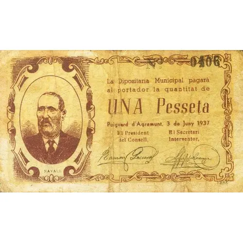 La Dipositaria Municipal pagarà al portador la quantitat de UNA Pesseta Puigverd d`Agramunt, 3 de Juny 1937 (Translation: The Municipal Depositary will pay the bearer the amount of One Peseta Puigverd d`Agramunt, June 3, 1937) |