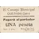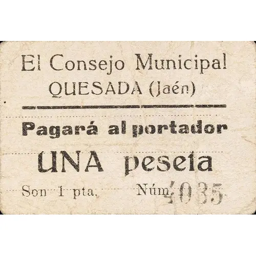 El Consejo Municipal de QUESADA (Jaén) Pagará al portador UNA peseta Son 1 pta. (Translation: The Municipal Council of Quesada (Jaén) Will pay the bearer One Peseta It`s 1 Peseta) |