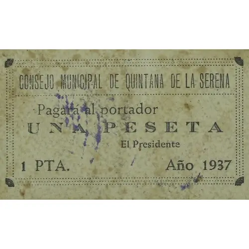 | Obverse lettering | CONSEJO MUNICIPAL DE QUINTANA DE LA SERENA Pagará al portador UNA PESETA 1 PTA. Año 1937 (Translation: Municipal Council of Quintana de la Serena Will pay the bearer One Peseta 1 Peseta Year 1937) |