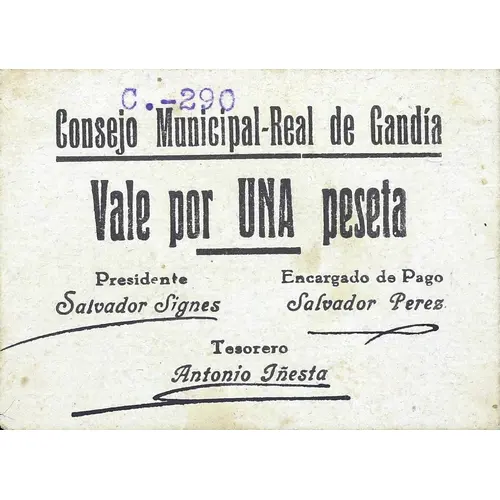 | Obverse lettering | Consejo Municipal - Real de Gandía Vale por UNA peseta Presidente, Encargado de Pago, Tesorero, (Translation: Municipal Council - Real de Gandía Voucher for One Peseta President, Paying Officer, Treasurer,) |