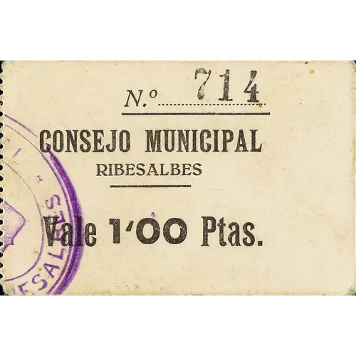 | Legenda del dritto | CONSEJO MUNICIPAL RIBESALBES Vale 1`00 Ptas. (Translation: Municipal Council Ribesalbes It`s worth 1.00 Pesetas) |