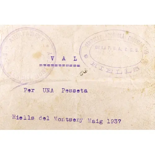 | Obverse lettering | VAL per UNA pesseta Riells del Montseny Maig 1937 (Translation: Voucher For One Peseta Riells del Montseny May 1937) |