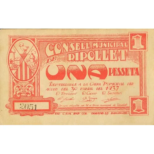 Obverse lettering CONSELL MUNICIPAL DE RIPOLLET UNA PESSETA REINTEGRABLE A LA CAIXA MUNICIPAL PER ACORD DEL 30 D`ABRIL DEL 1937 De curs obligatori per tot el terme municipal de Ripollet