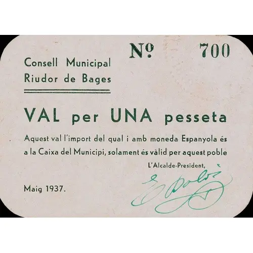 Consell Municipal Riudor de Bages VAL per UNA pesseta Aquest val l`import del qual i amb moneda Espanyola és a la Caixa del Municipi, solament és vàlid per aquest poble. Maig 1937. (Translation: Municipal Council Riudor de Bages Voucher of One Peseta This voucher the amount of which and in Spanish currency is in the Municipal Treasury, it is only valid for this town. May 1937.) |
