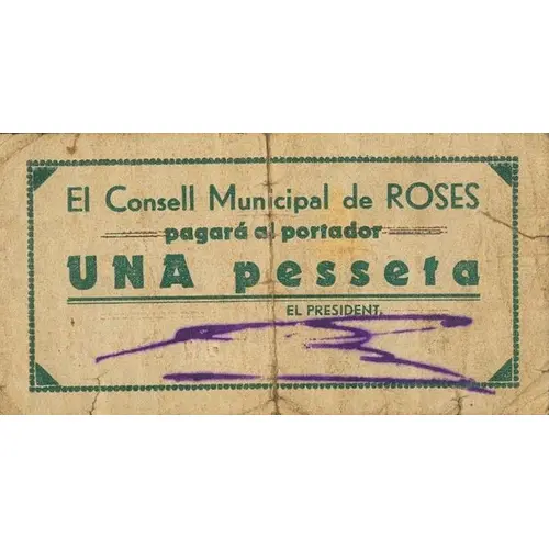 El Consell Municipal de ROSES pagarà al portador UNA pesseta (Translation: The Municipal Council of Roses will pay the bearer One Peseta) |