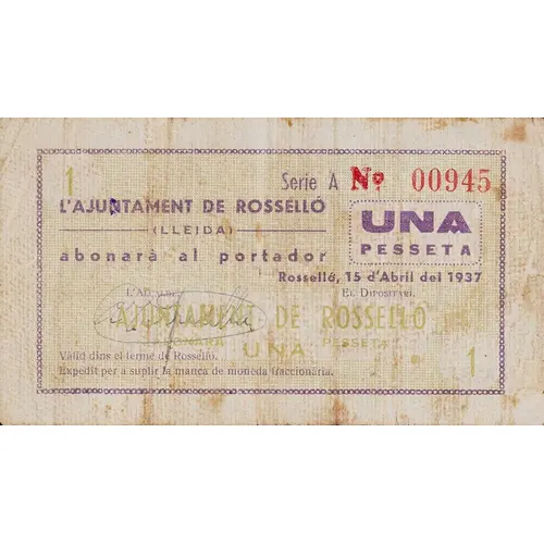 L`AJUNTAMENT DE ROSSELLÓ (LLEIDA) abonará al portador UNA PESSETA Rosselló, 15 d`Abril del 1937 Vàlid dins el terme de Rosselló. Expedit per a suplir la manca de moneda fraccionària. (Translation: The City Council of Rosselló (Lleida) will pay the bearer One Peseta Rosselló, April 15, 1937 Valid within the territory of Rosselló. Issued to make up for the lack of fractional currency.) |