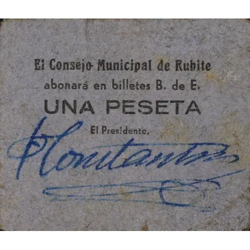 El Consejo Municipal de Rubite abonará en billetes B. de E. UNA PESETA El Presidente, (Translation: The Municipal Council of Rubite will pay in banknotes Bank of Spain One Peseta The President,) |