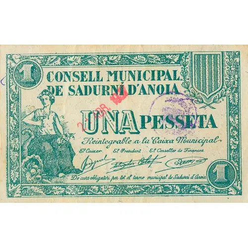 1 CONSELL MUNICIPAL DE SADURNÍ D`ANOIA 21 ABR. 1937 (with red buffer stamp) UNA PESSETA Reintegrable a la Caixa Municipal De curs obligatori per tot el terme municipal de Sadurní d`Anoia (Translation: Municipal Council of Sadurní d`Anoia April 21, 1937 (with red buffer stamp) One Peseta Redeemable at the Municipal Treasury Mandatory course for the entire municipality of Sadurní d`Anoia) |