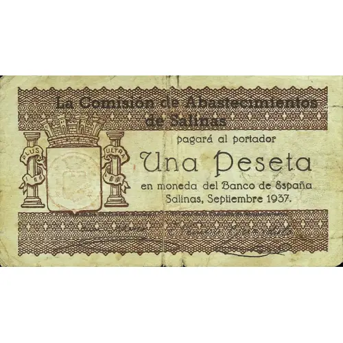 La Comisión de Abastecimientos de Salinas pagará al portador Una Peseta en moneda del Banco de España Salinas, Septiembre 1937. (Translation: The Supply Commission of Salinas will pay the bearer One Peseta in currency of the Bank of Spain Salinas, September 1937.) |