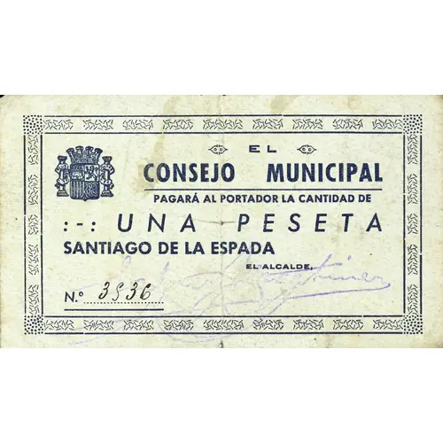 | Obverse lettering | EL CONSEJO MUNICIPAL PAGARÁ AL PORTADOR LA CANTIDAD DE UNA PESETA SANTIAGO DE LA ESPADA (Translation: The Municipal Council Will pay the bearer the amount of One Peseta Santiago de la Espada) |