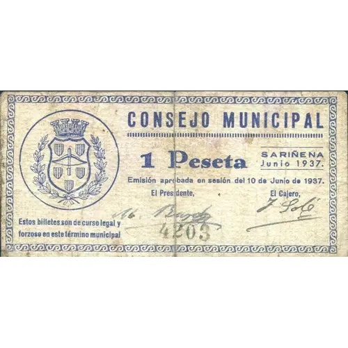 CONSEJO MUNICIPAL 1 Peseta. SARIÑENA Junio 1937. Emisión aprobada en sesión del 10 de Junio de 1937. Estos billetes son de curso legal y forzoso en este término municipal. (Translation: Municipal Council 1 Peseta. Sariñena June 1937. Emission approved in session of June 10, 1937. These banknotes are legal tender in this municipality.) |