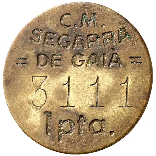 | Obverse lettering | C.M. SEGARRA = DE GAIÀ = 3111 (serial number) 1 pta. (Translation: Municipal Council Segarra de Gaià 1 Peseta) |