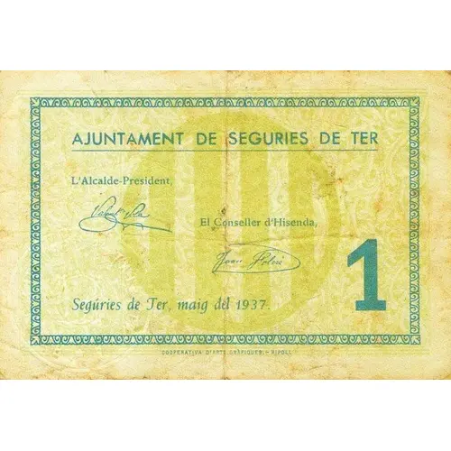 L`AJUNTAMENT DE SEGURIES DE TER Reconeix a favor del portador la quantitat de UNA PESSETA de circulació legal a Segúries de Ter 1 (Translation: The City Council of Segúries de Ter Recognizes in favor of the bearer the amount of One Peseta legal circulation in Segúries de Ter) |