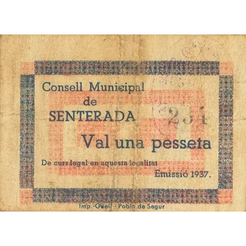 Obverse lettering Consell Municipal de SENTERADA Val una pesseta De curs legal en aquesta localitat EMISSIÓ 1937.
