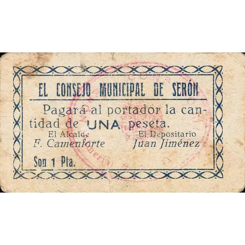EL CONSEJO MUNICIPAL DE SERÓN Pagará al portador la cantidad de UNA peseta. Son 1 Pta. (Translation: The Municipal Council of Serón Will pay the bearer the amount of One Peseta. It`s 1 Peseta) |