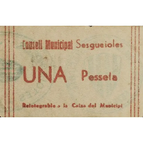 Consell Municipal Sesgueioles UNA Pesseta Reintegrable a la Caixa del Municipi (Translation: Municipal Council Sesgueioles One Peseta Redeemable at the Municipal Treasury) |