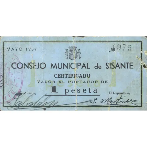MAYO 1937 CONSEJO MUNICIPAL de SISANTE CERTIFICADO VALOR AL PORTADOR DE 1 peseta (Translation: May 1937 Municipal Council of Sisante Certificate Value to the bearer of 1 Peseta) |