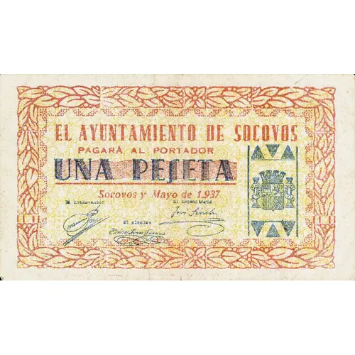 EL AYUNTAMIENTO DE SOCOVOS PAGARÁ AL PORTADOR UNA PESETA Socovos y Mayo de 1.937 (Translation: The City Council of Socovos Will pay the bearer One Peseta Socovos, May 1937) |