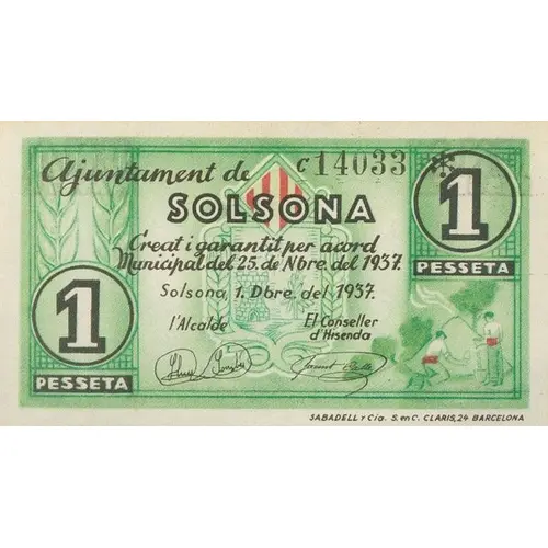 Ajuntament de SOLSONA 1 PESSETA Creat i garantit per acord Municipal del 25. de Nbre. del 1937. Solsona, 1. Dbre. del 1937. (Translation: City Council of Solsona 1 Peseta Created and guaranteed by Municipal agreement of November 25, 1937 Solsona, December 1, 1937) |