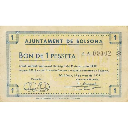 1 AJUNTAMENT DE SOLSONA BON DE 1 PESSETA Creat i garantit per acord Municipal del 11 de Març del 1937 Aquest BON es de circulació forçosa per tota la comarca de Solsona. Solsona, 19 de Març del 1937 (Translation: City Council of Solsona Bond of 1 Peseta Created and guaranteed by Municipal agreement of March 11, 1937 This Bond is mandatory for circulation throughout the Solsona region Solsona, March 19, 1937) |