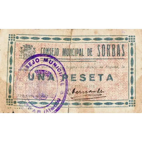 CONSEJO MUNICIPAL DE SORBAS Pagará al portador en billetes del Banco de España, la cantidad de UNA PESETA 15 Agosto de 1937 (Translation: Municipal Council of Sorbas Will pay the bearer in banknotes of the Bank of Spain, the amount of One Peseta August 15, 1937) |