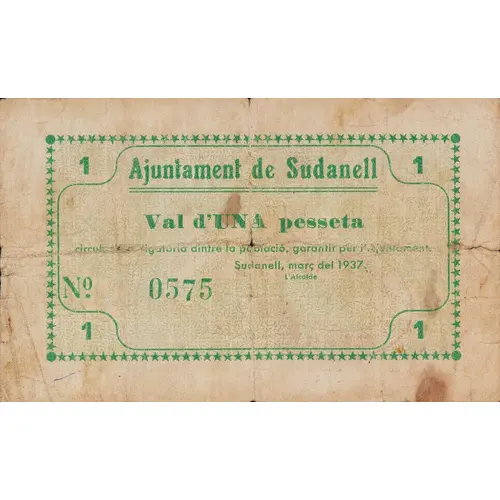 1 Ajuntament de Sudanell Val d`UNA pesseta circulació obligatoria dintre la població, garantit per l`Ajuntament. Sudanell, març del 1937. (Translation: City Council of Sudanell Voucher of One Peseta mandatory circulation within the town, guaranteed by the City Council. Sudanell, March 1937.) |
