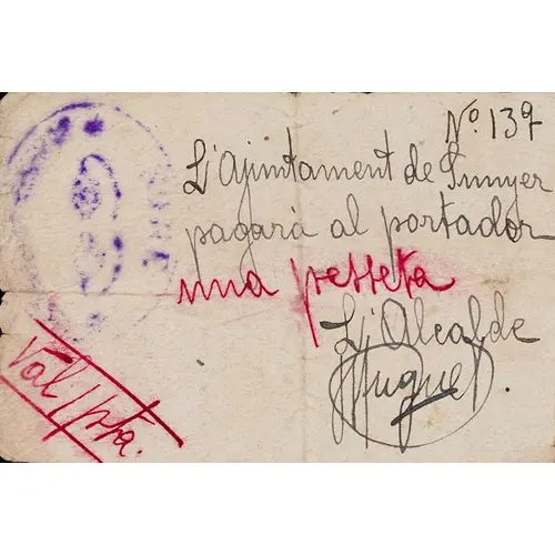L`Ajuntament de Sunyer pagarà al portador una pesseta Val 1 pta. (Translation: The City Council of Sunyer will pay the bearer One Peseta It`s worth 1 Peseta) |