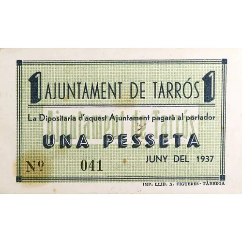 1 AJUNTAMENT DE TARRÓS 1 La Dipositaria d`aquest Ajuntament pagarà al portador UNA PESSETA JUNY DEL 1937 IMP. LLIB. A. FIGUERES - TÀRREGA (Translation: City Council of Tarrós The Dipositary of this City Council will pay the bearer One Peseta June, 1937) |