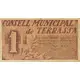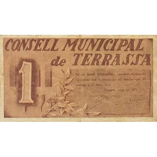CONSELL MUNICIPAL DE TERRASSA Val per una pesseta, quantitat reemborsable i garantida amb la reserva que del circulant resta dipositada a la Banca local. Terrassa, maig del 1937. 1 (Translation: Municipal Council of Terrassa It is valid for One Peseta, an amount refundable and guaranteed with the remaining reserve of the circulating currency deposited in the local Bank. Terrassa, May 1937.) |