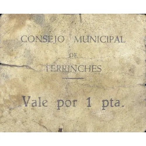 CONSEJO MUNICIPAL DE TERRINCHES Vale por 1 pta. (Translation: Municipal Council of Terrinches Voucher for 1 Peseta) |