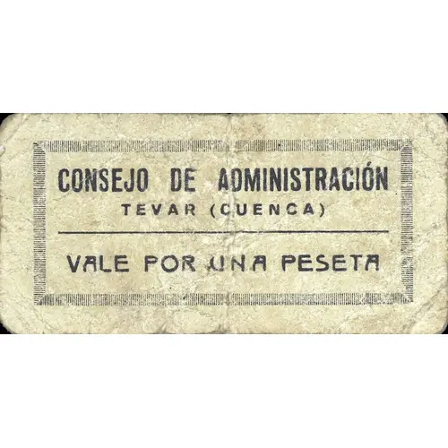 | نوشتههای روی اسکناس | CONSEJO DE ADMINISTRACIÓN TEVAR (CUENCA) VALE POR UNA PESETA (Translation: Management Council Tevar (Cuenca) Voucher for One Peseta) |