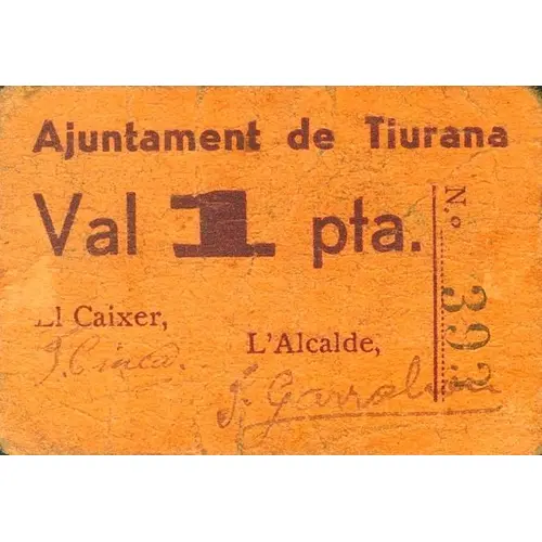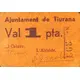 Ajuntament de Tiurana Val 1 pta. (Translation: City Council of Tiurana Voucher 1 Peseta) |