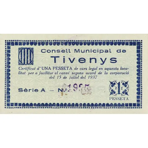 Consell Municipal de Tivenys Certificat d`UNA PESSETA de curs legal en aquesta localitat per a facilitar el canvi segons acord de la corporació del 15 de juliol del 1937 1 PESSETA (Translation: Municipal Council of Tivenys Certificate of One Peseta of legal tender in this locality to facilitate the change according to the agreement of the corporation of July 15, 1937 1 Peseta) |