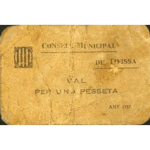 CONSELL MUNICIPAL DE TIVISSA VAL PER UNA PESSETA ANY 1937. (Translation: Municipal Council of Tivissa Valid for One Peseta Year 1937.) |