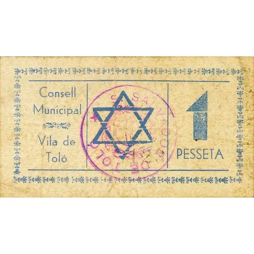 Consell Municipal Vila de Toló 1 PESSETA (Translation: Municipal Council Village of Toló 1 Peseta) |
