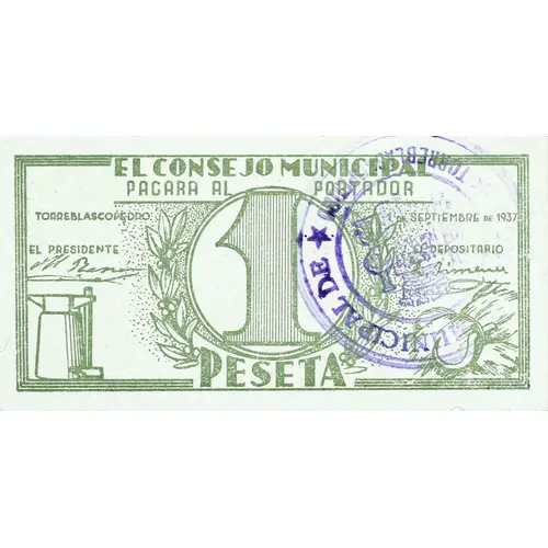 EL CONSEJO MUNICIPAL PAGARA AL PORTADOR 1 PESETA TORREBLASCOPEDRO 1 DE SEPTIEMBRE DE 1937 (Translation: The Municipal Council Will pay the bearer 1 Peseta Torreblascopedro September 1, 1937) |