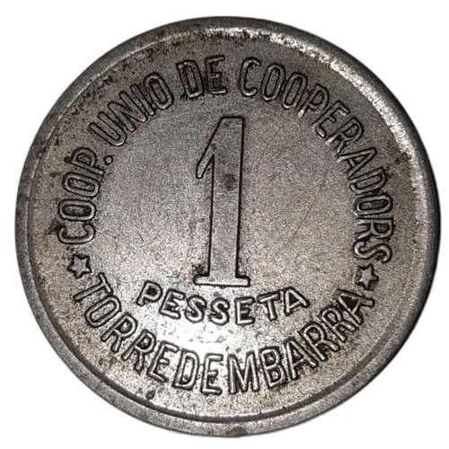 | Obverse lettering | COOP. UNIO DE COOPERADORS 1 PESETA TORREDEMBARRA (Translation: Cooperative Union of Cooperators) |