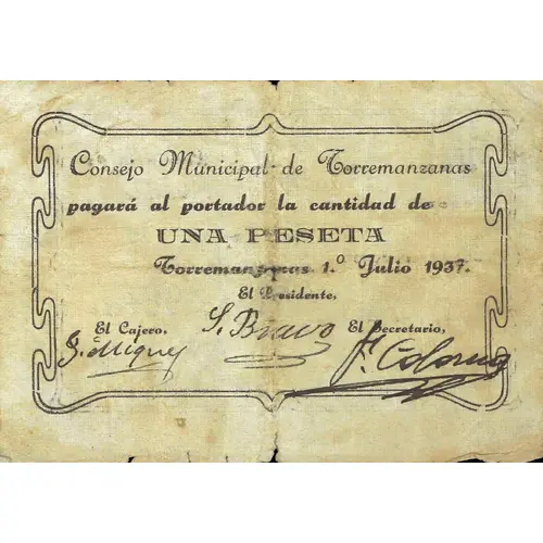 | Obverse lettering | Consejo Municipal de Torremanzanas pagará al portador la cantidad de UNA PESETA Torremanzanas 1.º Julio 1937. (Translation: Municipal Council of Torremanzanas Will pay the bearer the amount of One Peseta Torremanzanas July 1, 1937.) |